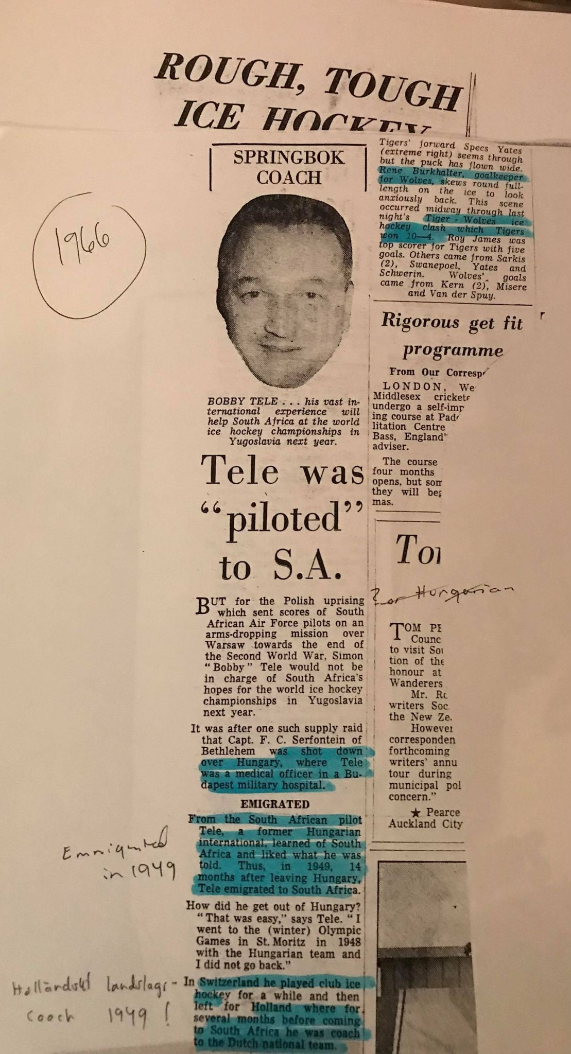 Asta pana in 1966 cand a revenit in antrenorat preluand nationala de hochei pe gheata a Africii de Sud, in pregatirile pentru Campionatul Mondial – Gupa C din 1966 ce au avut loc la Jesenice in Iugoslavia. Erau anii de inceput ai nationalei sud africane, 'Bobby' Tele mentionand intr-un interviu din acele vremuri, lipsa de patinoare (2 la acel moment) si numarul mic de jucatori din tara adoptiva.
